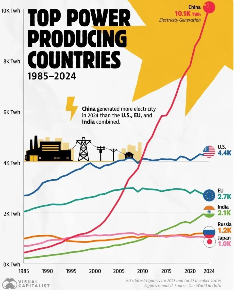 КНР впервые в истории достигла объема годовой генерации электроэнергии свыше 10 000 тераватт-часов, установив новый глобальный рекорд. Таким образом, страна вырабатывает в 2,2 раза больше электричества, чем США, и почти в восемь раз больше, чем Россия.
